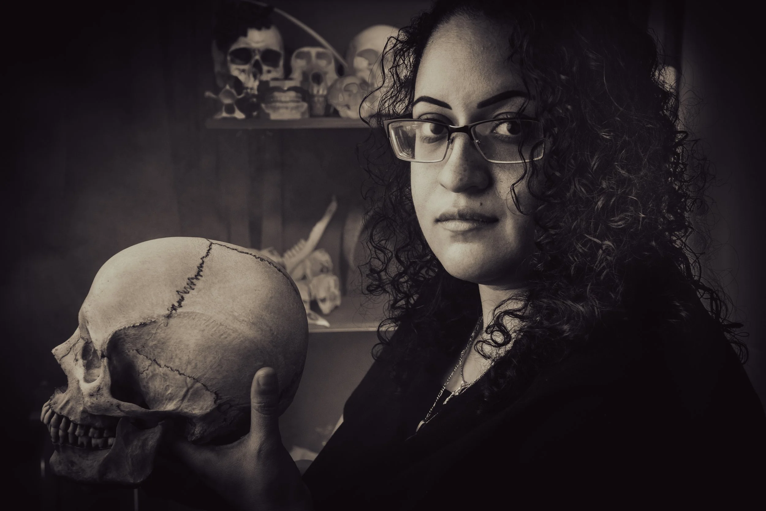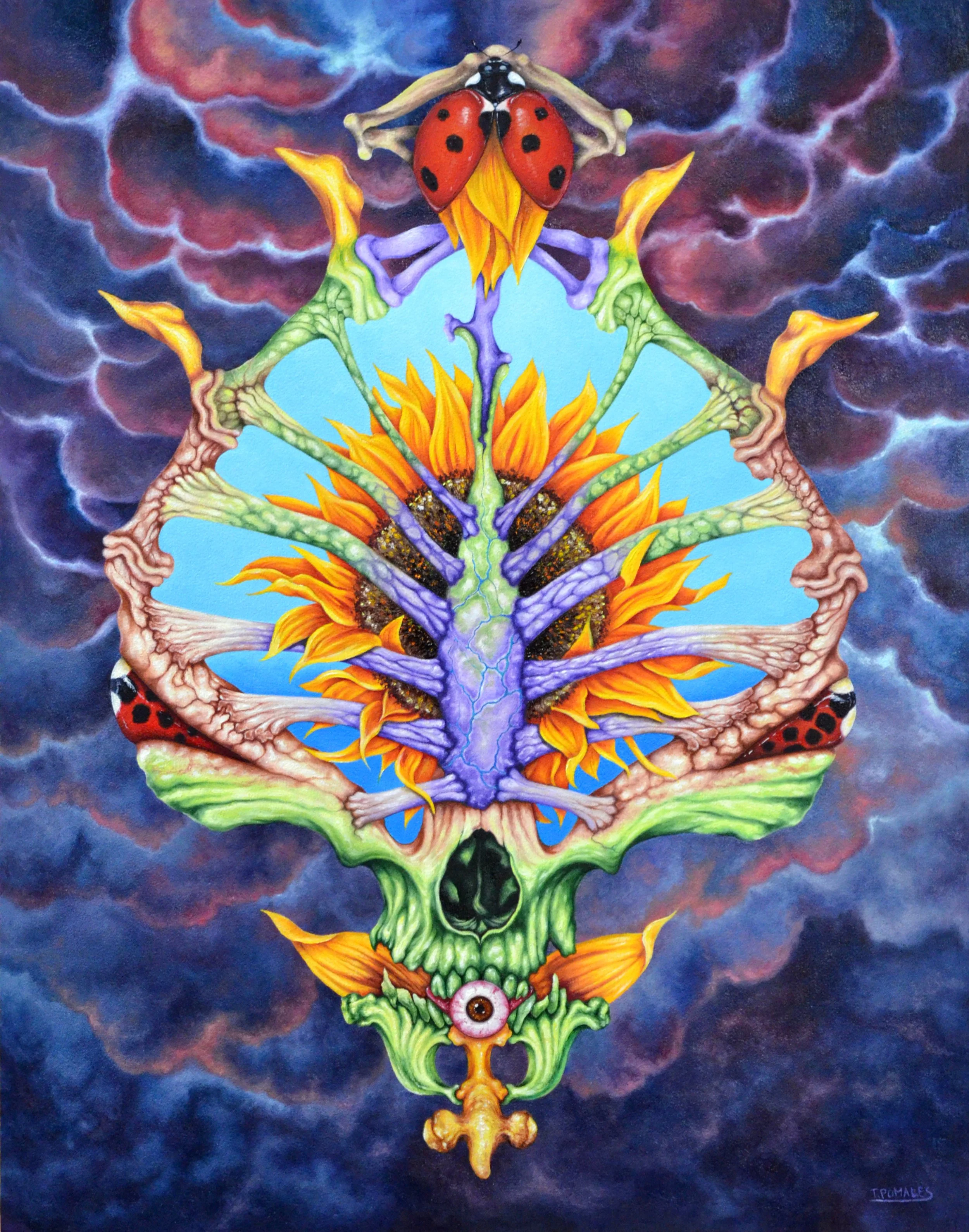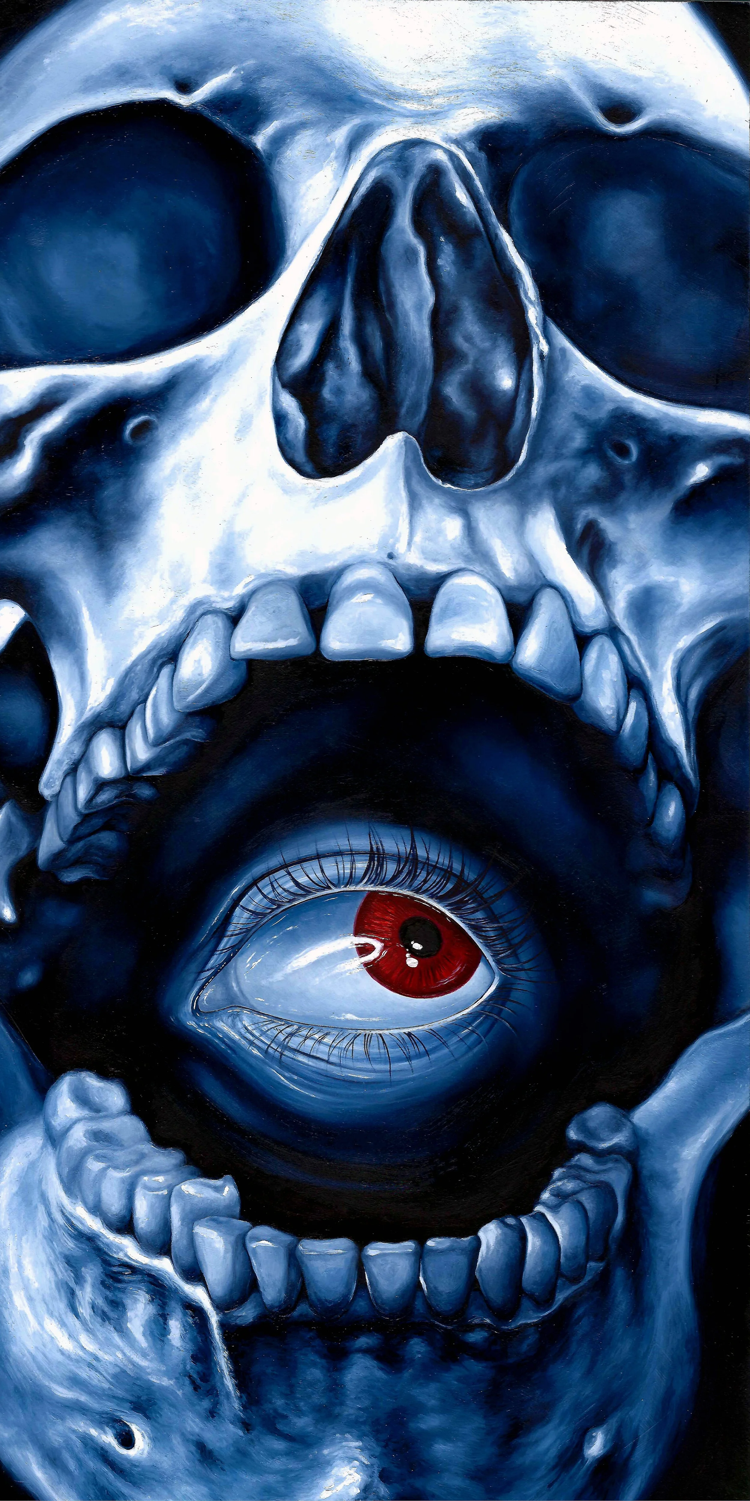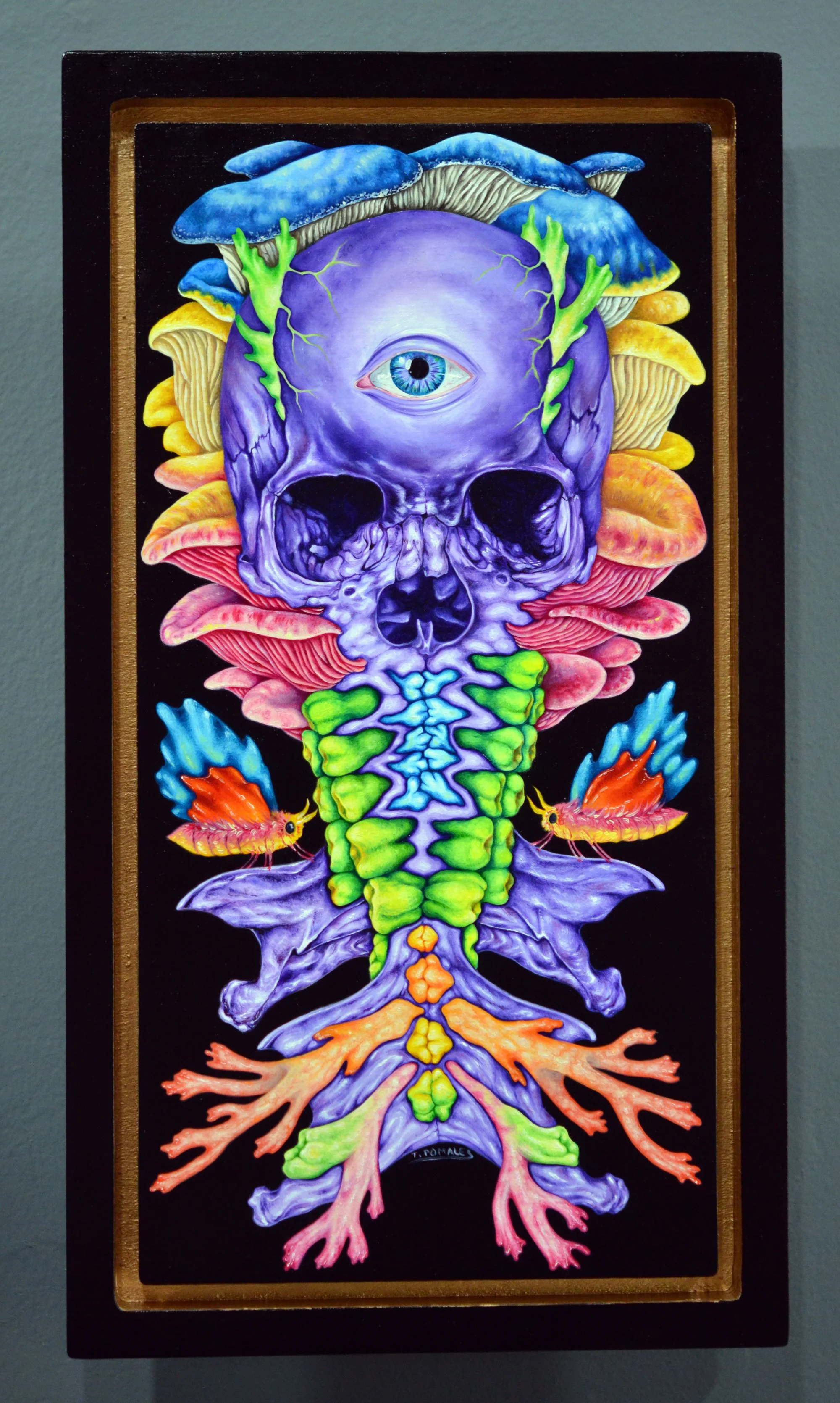 Tania Pomales is a New Jersey-based Puerto Rican artist whose work delves into dark, surreal themes with a signature style that juxtaposes vibrant color palettes against somber, sorrowful motifs. Specializing in oil painting, Pomales draws from her bold and colorful heritage and cultural roots to create visually enchanting pieces that explore the complexities of life, death, and the cyclical nature of the human experience. Her work often incorporates anatomical elements and skull imagery, symbolizing deeper reflections on mortality, mental health, and personal introspection. This recurring theme of skulls in her work has earned her the nickname the “Skull Queen” in the art community.